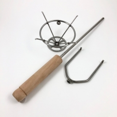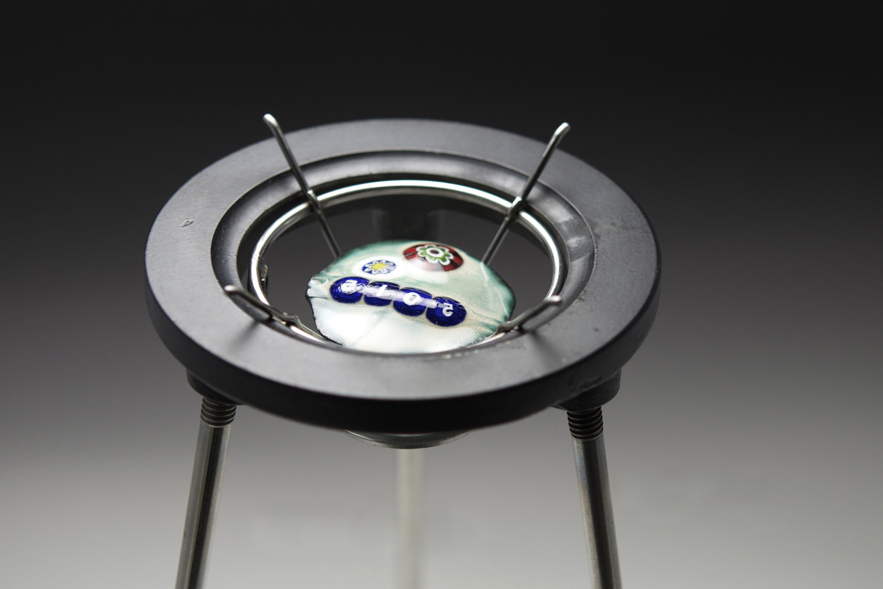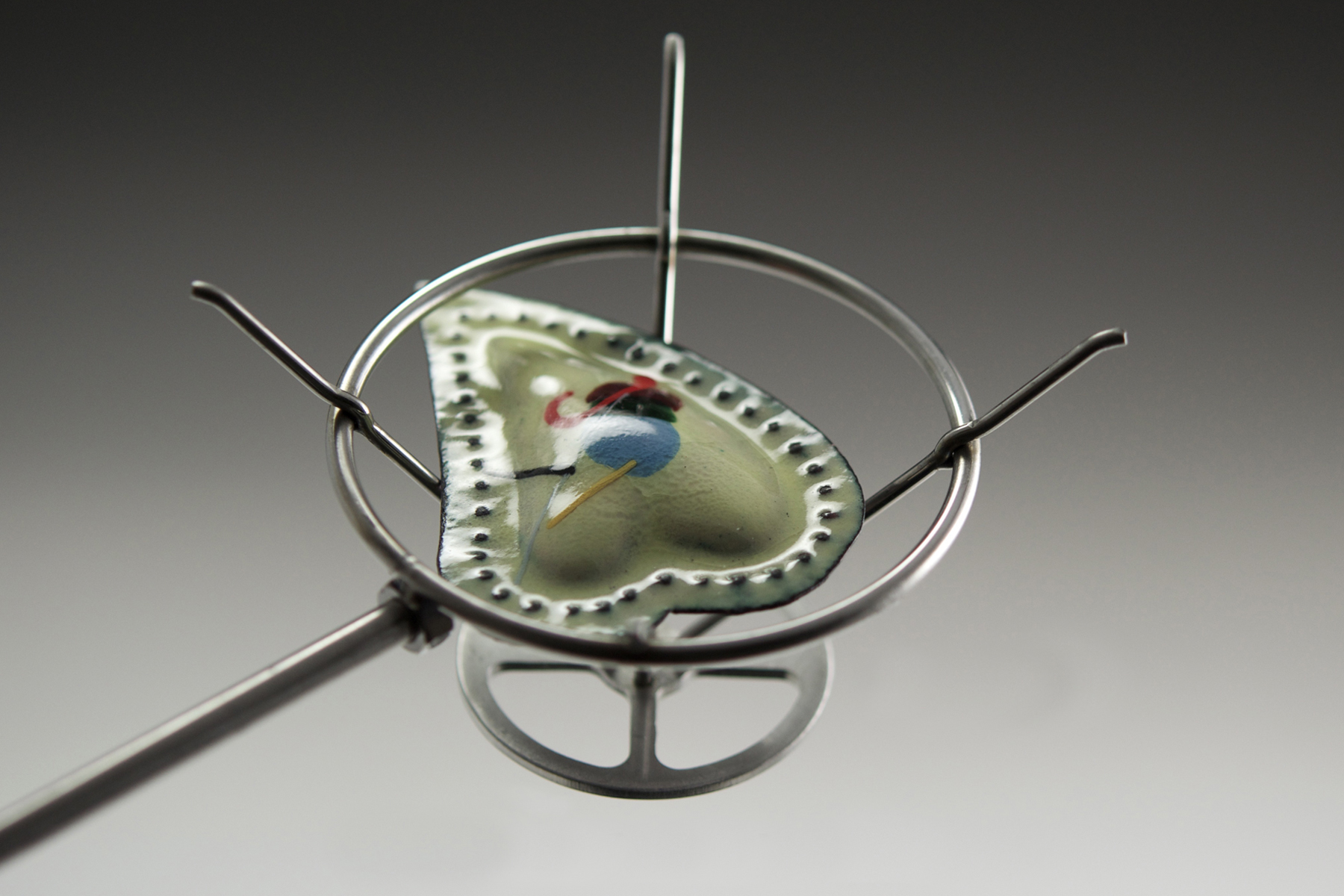 The Torching Basket can be used for the ever-popular torch enameling as well as for use in the kiln. There are 3 easy ways to use the enamel torching basket (pictured below): 1.) Attach the threaded end of the handle into the nut on the basket. Place the piece to be enameled in the basket and fire from underneath. 2.) Drop the basket into a soldering tripod, place your piece to be enameled in the basket and fire from underneath the piece. 3.) Place piece to be fired in the basket, attach the handle to the fork, and then lift the basket and place in the kiln. Follow kiln instructions for firing. The contact of your enameled piece to the basket is minimal, meaning there is little to no clean up afterwards. No more frustration of pieces slipping and dropping.