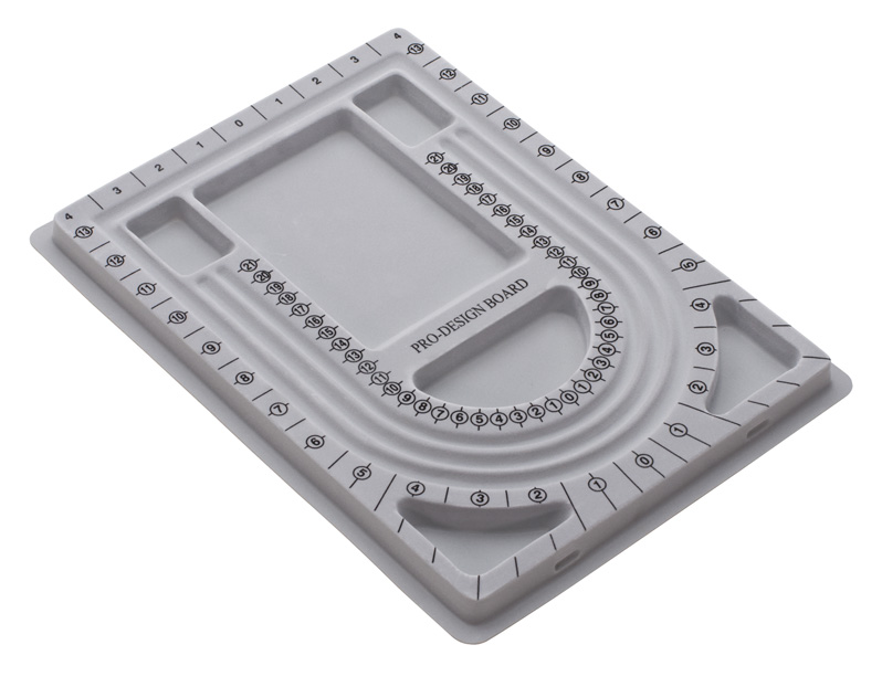 Our Pro-Design bead boards feature heavy, durable plastic with a thick gray flocking to help your beads and designs stay in place when creating. Features half-inch increment marking and three-strand capacity with 6 easy-out compartments to store your beads, findings, needles and other stringing supplies. This is an exceptionally priced, quality board. 13" x 9-1/2"