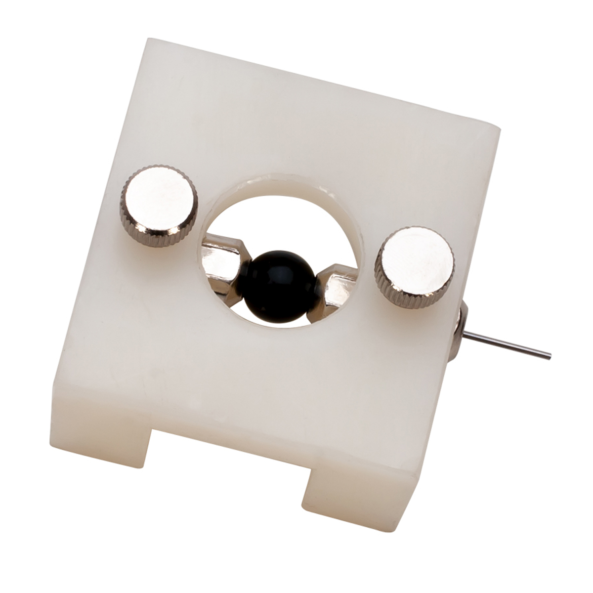 Make pearl and bead drilling easy with this clever vise. Two brass cupped jaws hold the stone securely and lined up perfectly centered to allow drilling from both sides without breaking or cracking. The hole is large enough to accept a 1mm drill. Great for use with our high speed twist drills. 2" x 2" x 1-1/4"