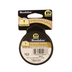 Combine the flexibility and strength of 19 strand wire with the luster of precious metal. Supple 19 strand stainless steel wire is plated with 24K gold precious metal, then coated with clear, soft nylon. Gold Plated, .015" (Fine), 15 Feet