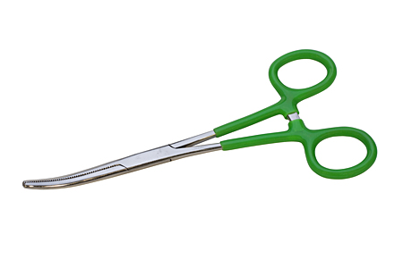 Handy, plier-like tools made originally for medical purposes work perfectly as clamps for small articles. Made of stainless steel, the box-joint construction and serrated jaws provide firm holding. Has a three-position locking device. Curved, 6" long.