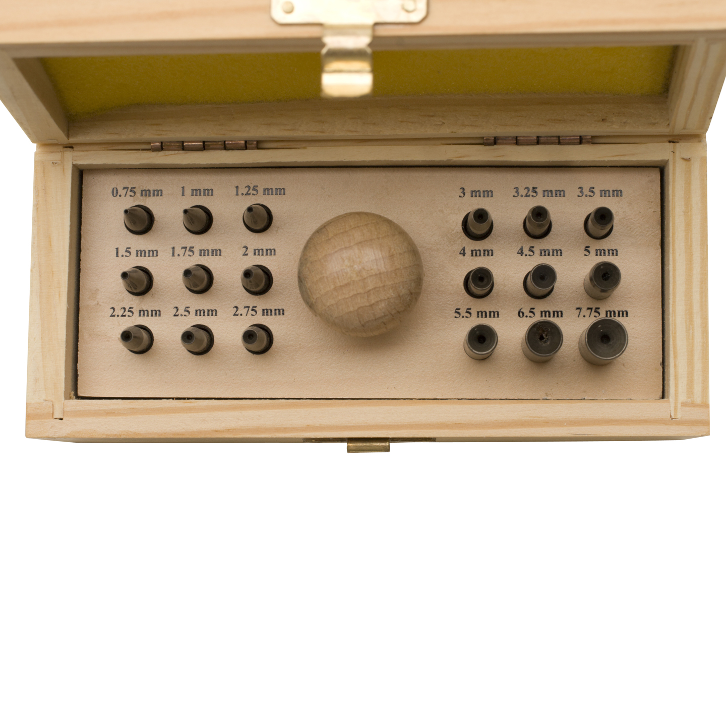Stone setting system with hardwood handle and 18 concave tempered punches is ideal for setting stones. Simply insert the stone and press the punch directly over the prongs to set. The concave shape pushes prongs in gently and evenly. This system is especially good for more fragile stones. Supplied in an attractive wood box, it will set stones from 2mm up to 6mm in diameter.