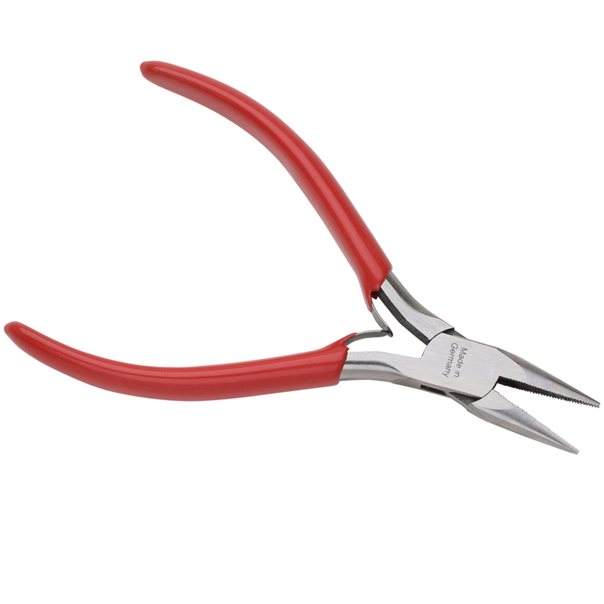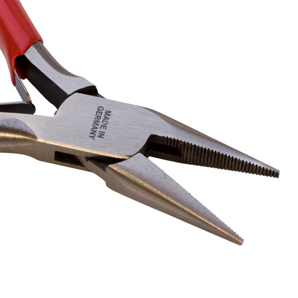 Eurotool's Extra Duty box-joint pliers feature double-leaf springs and red vinyl grips. Made in Germany of the finest European steel. Features: Style: Chain Nose. Serrated jaws for extra grip. Nose is tapered to fine point to bending and most utility work. Length: 5 Inches (125mm).