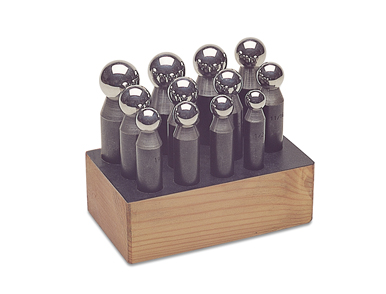 Set of twelve anodized steel punches with highly polished heads for shaping metals or use with dapping dies. Includes sizes 1/2, 9/16, 19/32, 5/8, 11/16, 23/32, 3/4, 25/32, 13/16, 7/8, 15/16 and 1. Weighs 5.25 lbs.