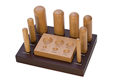 Another EURO TOOL original! This wood dapping set features 8 domed punches and a wood block with matching depressions. Punches range in size from 10mm up to 31mm in 3mm increments, includes a stand with measurements for each punch. Made of hard wood to stand up to continuous use without marring the metal. A nice addition to any jeweler's work bench.