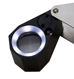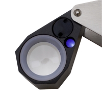 Two light sources in one loupe! Use this Triplet 10X Lighted Loupe in low light environment or when extra light is desired. The ring of six LED lights surround a lens measuring 21mm providing a clear, even illumination without casting shadows or harsh reflection. The UV light is used for checking fluorescence in diamonds. The black, non-reflective housing of the loupe reduces glare and prevents color distortion. See the luster and clarity every time! Batteries included.