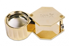This gold, 10X "hex" triplet with a 21.5mm lens offers the user a wide field of view and great optics. The case is hexagonal, but the head is actually an elegant twelve faceted design. Comes supplied in a convenient leather case.