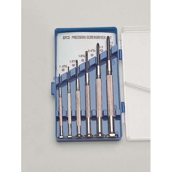 Our six piece screwdriver set includes four straight blade screwdrivers (1.0, 1.20, 1.80, 2.40mm) along with #0 and #1 Phillips screwdrivers. All have hexagonal swivel heads. Packed in a convenient hard plastic box.
