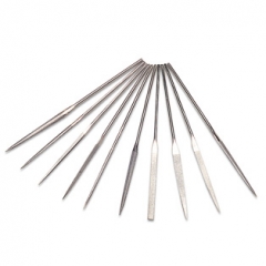 Economy diamond needle file set of ten pieces. All are 4" (100mm) long with fine grit diamond electroplated onto high-grade tool steel. Set includes: round, half-round, flat, three-square, square, warding, slitting, oval, knife and barrette.
