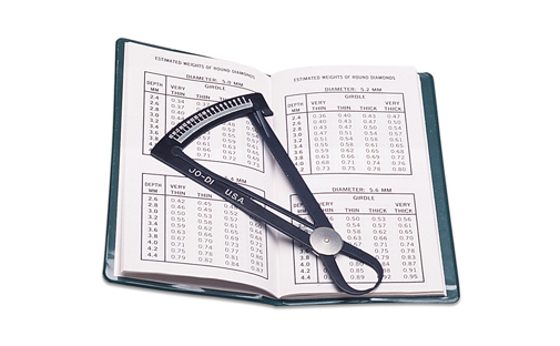 This tool allows you to estimate the weight of all popular shapes of diamonds without removing the stone from the mounting. The only caliper gauge that reads round, emerald, pear and marquis shaped diamonds. Made of anodized black aluminum with clear numbers, it comes with a conversion booklet.