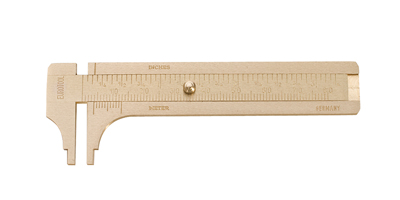 This pocket sliding gauge is ideal for measuring gemstones and other jewelry components. It is made of brass with notched jaws and a 1/10mm vernier for accuracy. This gauge is 80mm (3") long.