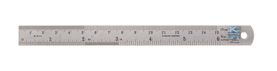 This fine 6" steel ruler is useful for quick measurements or scribing lines and features a hole in one end for hanging and includes a handy conversion chart on the back (inches to millimeters).
