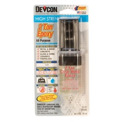 Devcon epoxy adhesive cures and joins materials together by a chemical reaction between the resin and hardener. This reaction results in a high strength bond that is resistant to most chemicals. Use Devcon Epoxy adhesive for household, industrial, crafts or for any job that requires a high-strength, high-quality bond. Works best on metal, wood, concrete, glass, ceramics, china and much more. 2-Ton Epoxy sets in 30 minutes with strength up to 2,500 lbs. per square inch. Dries clear; water resistant.