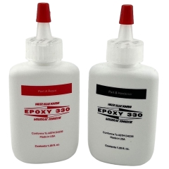 Epoxy 330, water-clear glue, line bonds with fast setting time. Used to bond gem materials to metal findings and takes a high polish for inlay. It can also be used for invisible bonding of glass, china, ceramics, stone, metals and other non-porous materials. Thickens in 15 minutes and hardens in 2 hours. Hardens in 10 minutes under a heat lamp. 1/2 ounce tube, pack of 2.