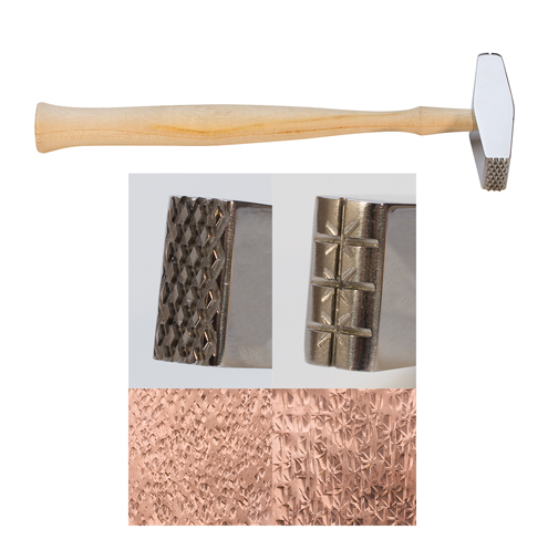 Texturing hammers for non-ferrous metals. Our double-sided hammers enable the user to make attractive patterns to give jewelry and other metal items a special look. You get two different patterns with this hammer, crosshatch (diamonds) and stars. Just place sheet metal on a flat metal block or anvil and strike sharply. In no time you will have interesting patterns. Hammers have a Rockwell hardness of 48 and the more the hammer is used, the more interesting the patterns become. Let your imagination take over - our hammers will provide you with a simple and easy method to give your finished piece that extra flair. 10" long and 1-3/8" in diameter.