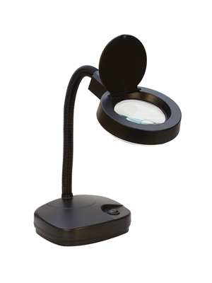 This affordable 5X magnifier lamp offers the user a portable solution to viewing small items. With a 3.5" lens, see all the details and work with greater ease and better results. Easy on-off switch and flip down cover to keep the magnifier free from dust. Lamp is a cool-white light that renders colors perfectly and reduces eye fatigue. Flexible gooseneck design allows the user to adjust the lamp to various heights and positions. Sturdy metal base encased in plastic housing. Excellent for scientific applications, printing, stamp collectors, arts and crafts, detailed painting, hobby and modeling and so much more.