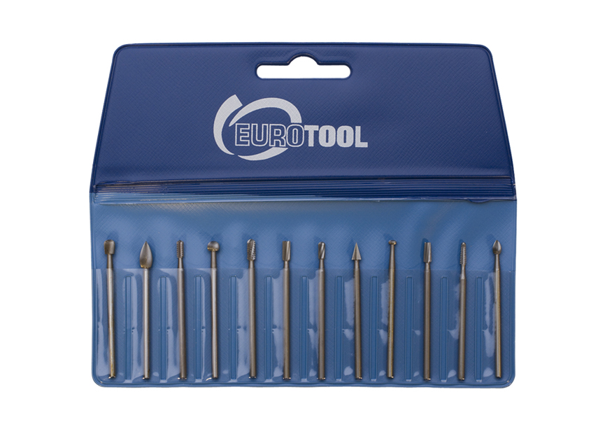 Set of twelve medium wax bur set features coarse no-clog flutes and are made of Tungsten Vanadium for years of service. Shanks are a EURO TOOL exclusive 3/32 inch for quick change handpieces. Excellent for wood or plastic. Sets may vary. Burs in the set may be different than pictured in photo.