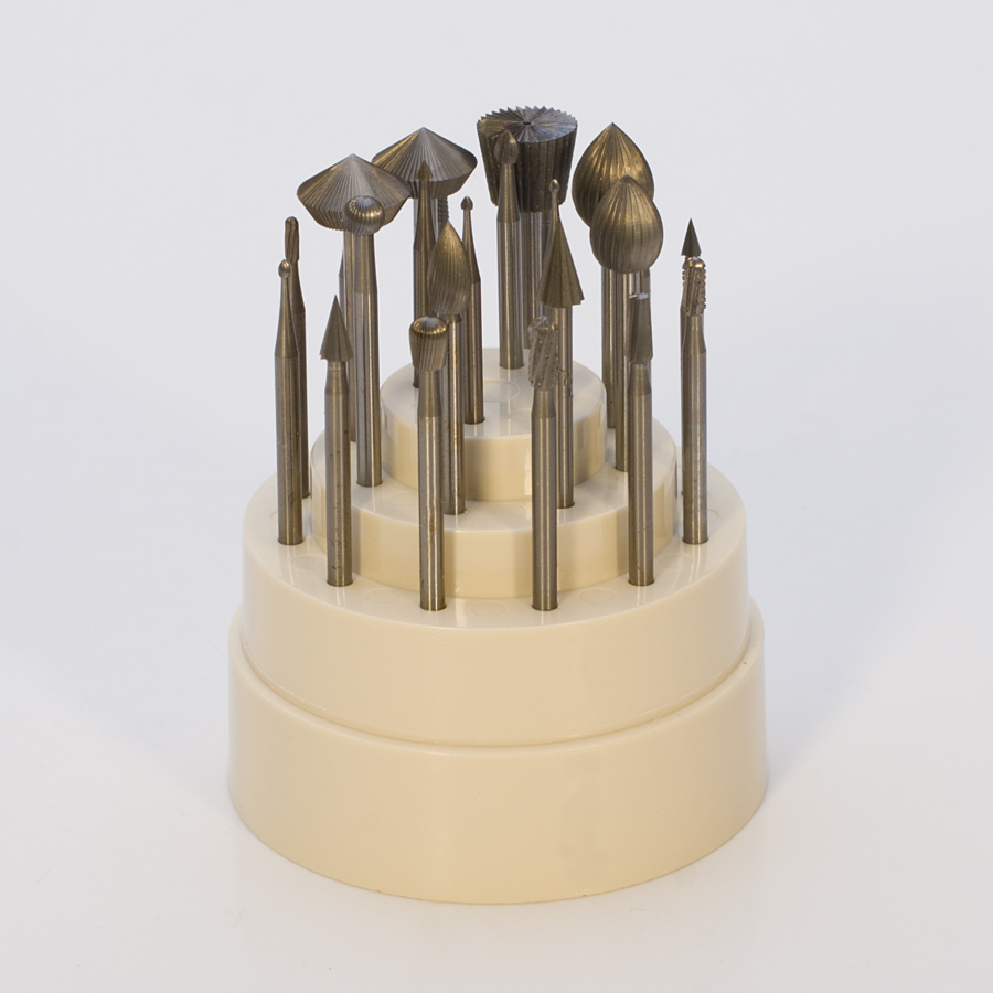 This 24 piece set offers the largest variety of wax burs available in a single set. All are Swiss made Tungsten Vanadium with deep flutes for carving wax when designing jewelry and other items. Our wax bur set is also excellent for woodworking and plastic. All burs have 3/32" shanks and approximately 44.5mm total length.