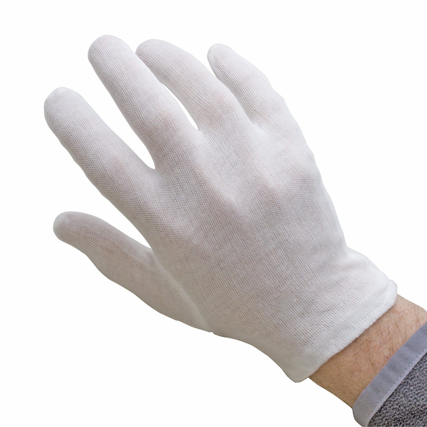 Lightweight inspection gloves protect jewelry, displays, silverware and optical surfaces keeping it free from fingerprints and tarnish. Sold by the dozen. Men's size large.
