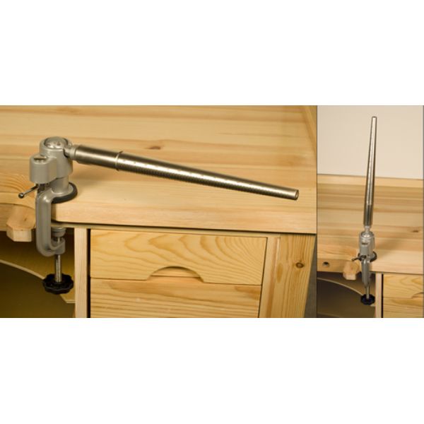 Introducing the 360 degrees Mandrel Vise. Unique ball and socket provides 360degrees swivel/pivot as well as horizontal position with a locking mechanism to hold firmly at any angle. Great for wirework and more. Simply screw on the mandrel and work hands free. This solves the problem of working with the mandrel when both hands are needed. The vise may be clamped to most benches or table tops with an opening up to 2-1/8". This vise works exclusively with MAN-255.00 or MAN-260.00, both from EURO TOOL and available here on Jewelry Tools. Not meant for heavy hammering. A Jewelry Tools Best Seller!