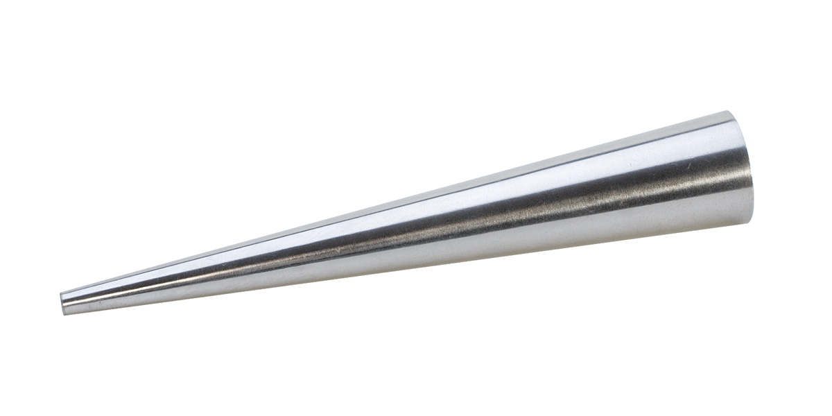 Our round hoop mandrel measures 12", with a threaded rod attachment for hands free use, and is hard chrome plated steel with a highly polished surface and tapers from 3/8" to 2" (10mm to 52mm) for a wide range of rings, earrings, hoops and bracelets, giving it a great variety of uses for goldsmiths, silversmiths, jewelers and bead artists. The weight of solid steel gives it the heft that one needs to more easily work non-ferrous metals. Weighs 4 lbs.