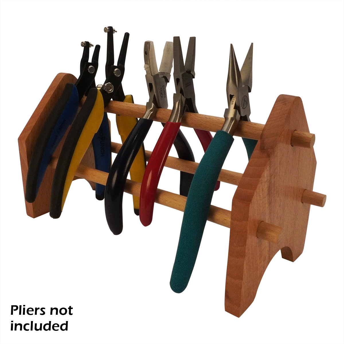 Finally, the easy-to-assemble (and disassemble) plier stand. Constructed of hardwood, lightweight, holds multiple pliers, and stands 7-1/2" x 4" x 5". The perfect workbench organizer!
