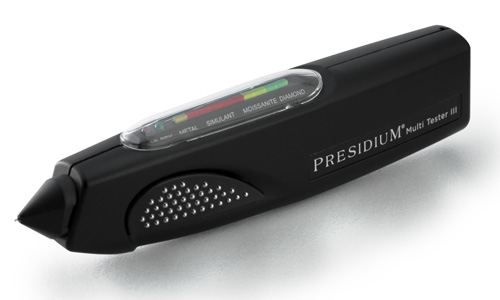 The Presidium Multi Tester III (PMuT III) utilizes the combined principles of Thermal and Electrical Conductivity from patented technology. The measuring probes, together with the electronics circuitries, are designed to pick up and segregate data collected from the stones via a customized micro-controller. It identifies metals, stimulants, moissanites and diamonds instantly. Within a split second the test result will be displayed. This tester includes surface mount technology, no waiting time between tests, 180-degree multi-viewing LED display, ergonomic design with rubberized anti-slip grip and auto power down. The retractable thermoelectric probe tip ensures accuracy and consistent pressure between the measuring probe and gemstone. Accurately tests on diamonds as small as 0.02ct. This tester runs on 3 AAA batteries (not included) or an AC adaptor (not included). Comes with a protective carrying case and measures 6-1/2" long.