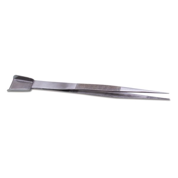 Our stone/bead shovel added onto a medium tip serrated stone tweezer allows more versatility and better handling of stones and beads. This tweezer is made of stainless steel with serrated tips. The combination of stone shovel and tweezer is convenient and time saving. 7-1/8" long.