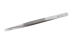 Swiss-made jewelry tweezers for diamonds and precious stones are made of stainless steel and have a matte finish. Unique waffle pattern in this fine point tweezer makes for a superior hold. Length 6-1/4 inches.