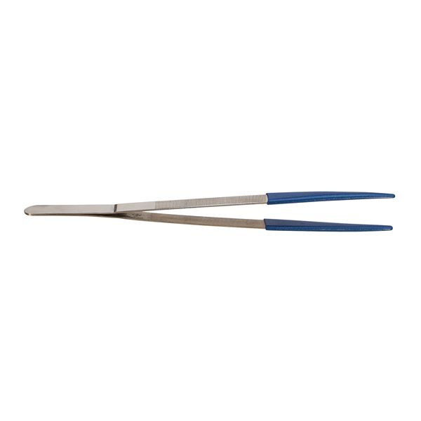 Chrome plated steam tweezers with thick coating on tips holds items securely. 10" long.