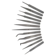 This twelve piece set of stainless steel anti-magnetic tweezers offers the user complete variety for any job. Ground and polished to perfection, this set has a nice touch for fine work in any environment. Points are perfectly aligned for a firm grip on the smallest articles. Set includes tweezers in sizes 2A, OOB, 2, AF, 3, AA, SS, 532, 7, 6, 3C and 5.