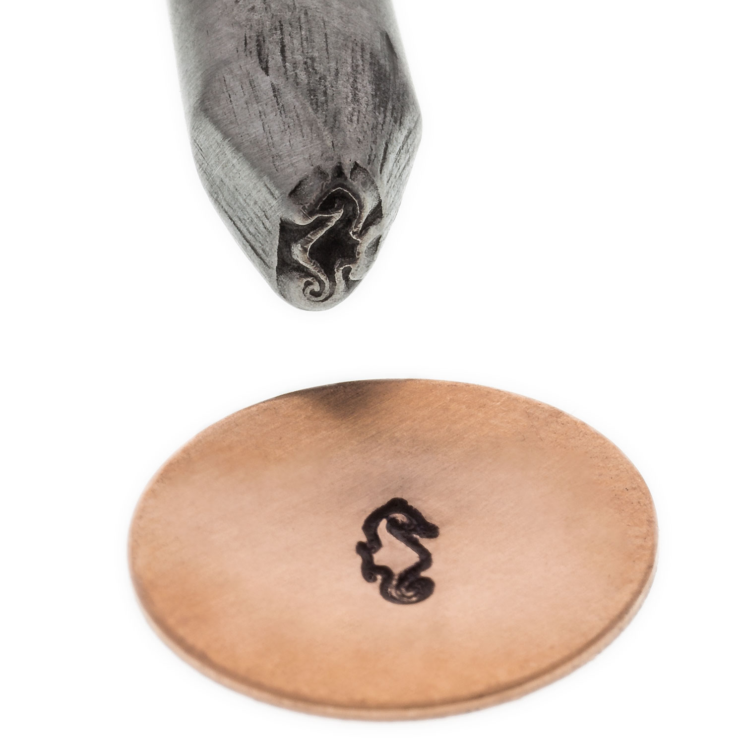 This decorative sea horse stamp is made of hardened steel for decorating all types of jewelry items. Designs like these can add value and interest to silver, brass and other metals. Their usage also gives an artistic effect and enables the designer to personalize each piece. Features a round shank and is 3-1/4" long. When used properly, this stamp will last for years. Made in USA.