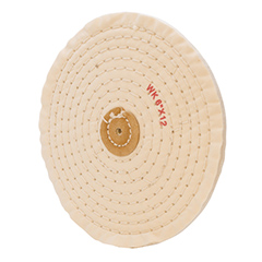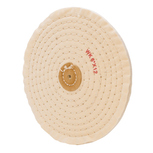 Work into crevices with this white knife edge buff. Made of very fine, soft combed muslin, stitched buffs are for use with polishing compounds to produce a final, high polish. Stitched with leather centers to add stiffness. 6 inch diameter, 12-ply.