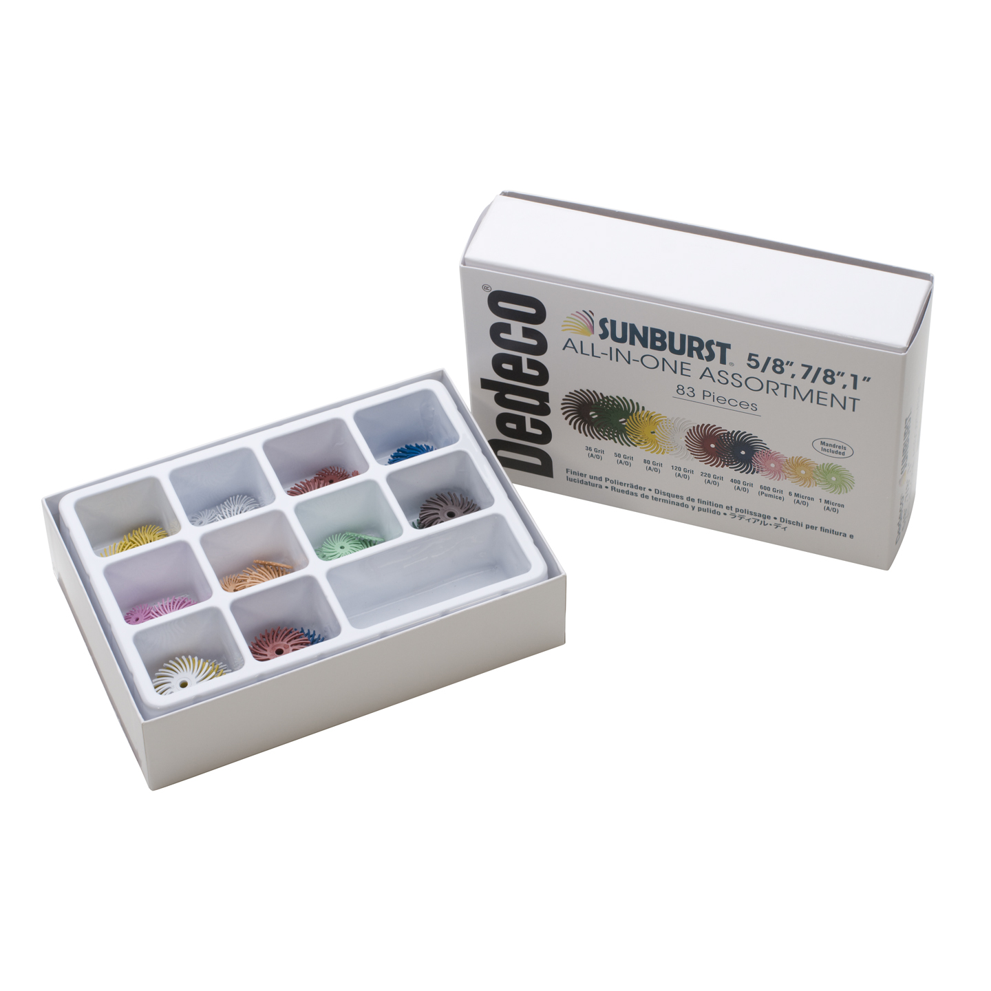 Assortments are a great way to try a variety of Sunburst® Radial Bristle Discs. Radial Discs are impregnated with a specially treated ceramic abrasive grain resulting in longer life and faster results requiring no polishing compound. Safer and more flexible than wire brushes. Long-lasting and cool running with operating speeds of 3,000 - 18,000RPM. Lower speeds allow a softer touch, greater flexibility and more subtle results. Higher speeds provide more aggressive material removal.