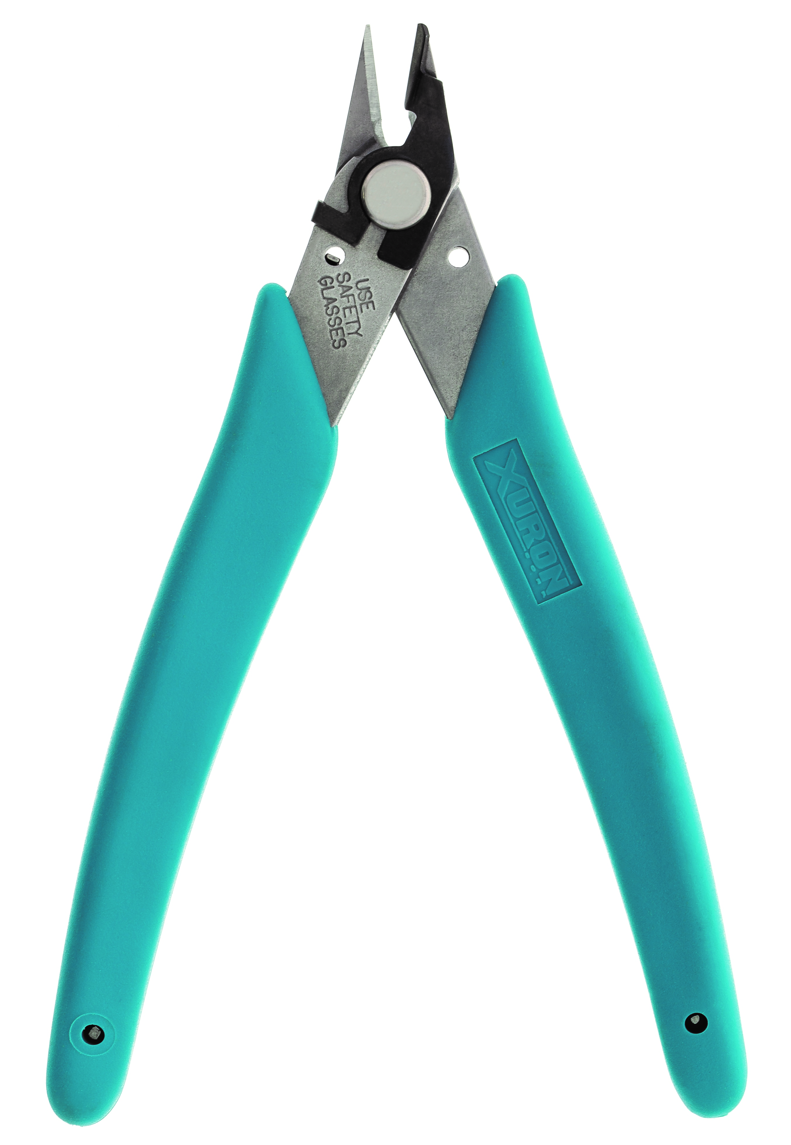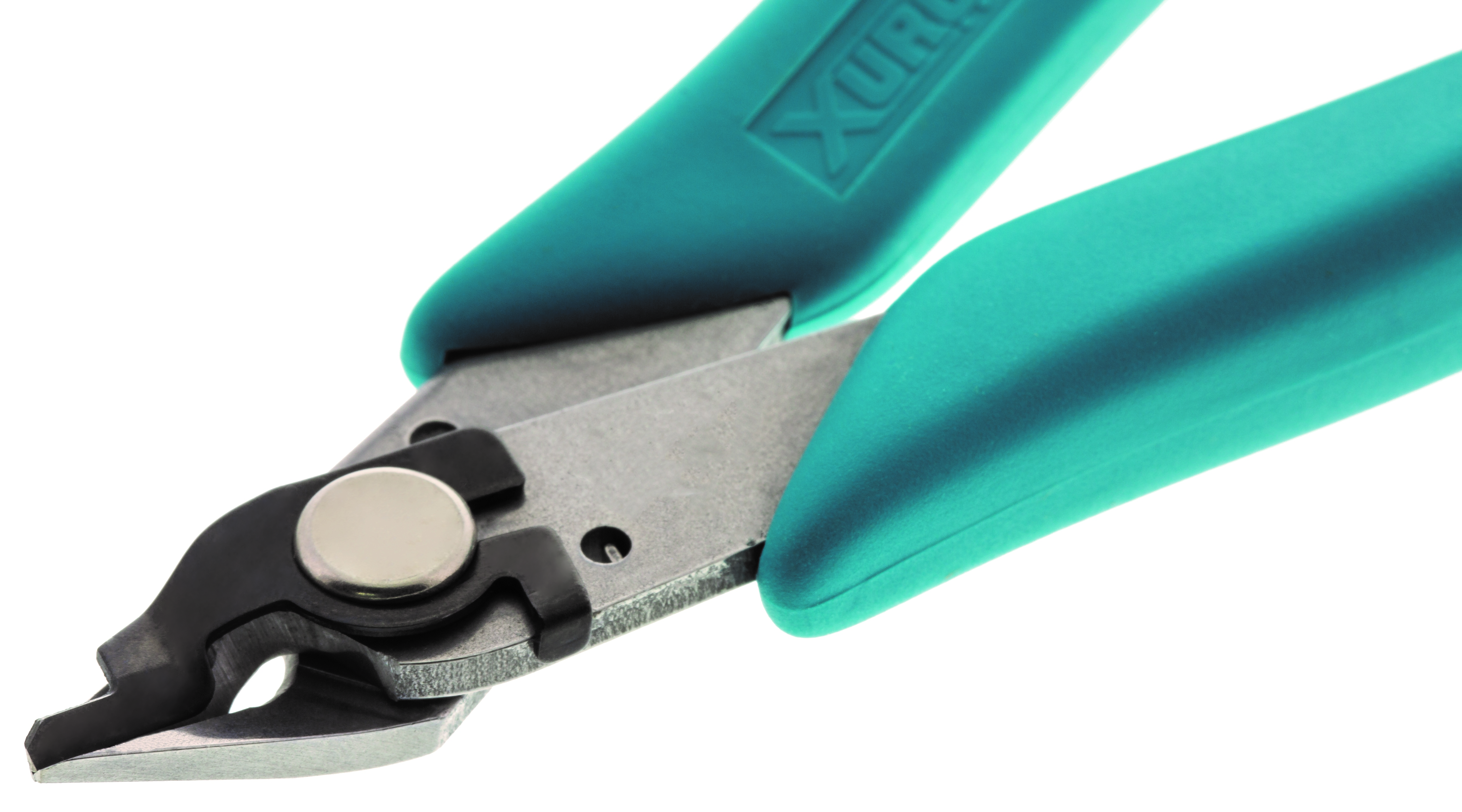 Xuron's mid-range Micro-Shear® Flush Cutter with Wire Retainer combines Micro-Shear® flush cutting action with precision ground cutting edges, extra tough 0.100" thick high carbon steel blades and an ultra slim profile. Blades are polished for a bright, glare resistant finish. Ergonomically sized for small hands and maximum maneuverability. Flush cuts soft wire up to 16 gauge (1.29mm).