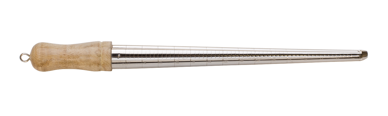 Always-popular hollow grooved ring stick measures 1 to 15 by U.S. standards. At the narrow end, the gauge shows length of metal needed for sizing. The handle is elegantly polished rosewood with a loop for hanging.
