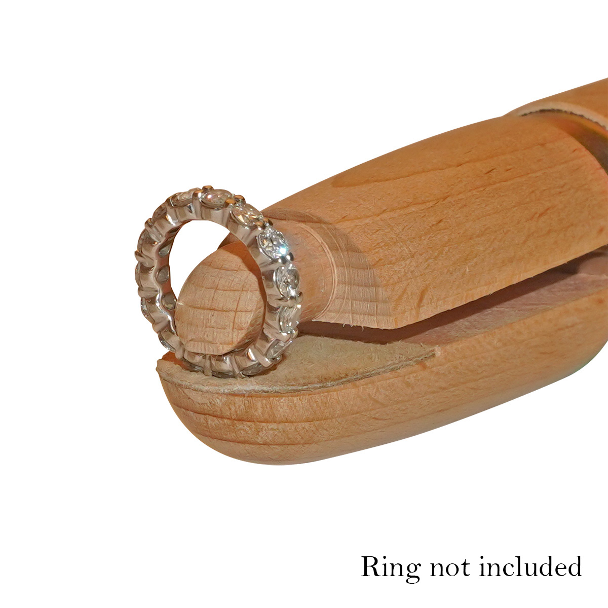 The Jeweler’s Choice Ring Clamp made of hardwood has a NEW cut-away jaw. Allows for work on rings not available with a standard ring clamp. Leather-lined jaws. The PATENTED Peg Wedge design provides for a superior grip. 6 inches in length.