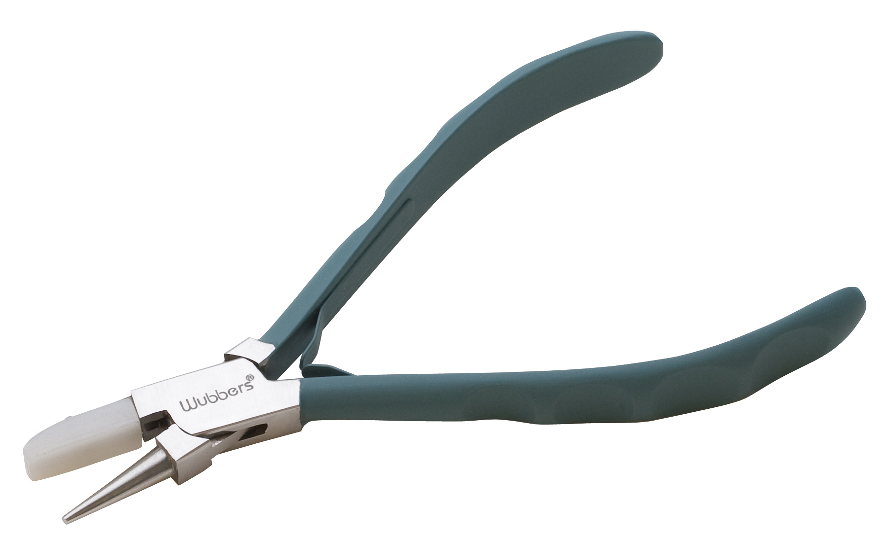 The newest addition to the Wubbers Pliers - the ProLine Series. Engineered for comfort and exceptional control, the ProLine series has real-feel ergonomic grips with a non-slip, suede-like coating giving the user greater control and "feel" of their project. Made of high quality steel, this plier has one flat nylon jaw and the other is metal round. Perfect for coiling wire or sheet metal. Recommended for use with up to 14 gauge soft wire. Length: 5-3/4". Replacement nylon jaws PLR-831.05.