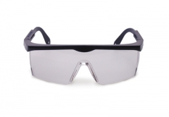 Wrap-around safety glasses are easily removable but protect eyes with comfort. Lenses are extra clear high impact material. Earpieces are four point adjustable. Distortion-free lenses and wrap-around design assures particles can't reach the users' eyes when worn properly. Glasses feature holes for elastic strap or chain. Made in Germany.
