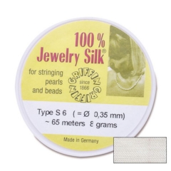 100% real silk thread of the highest quality for stringing beads and pearls. This German-made thread is strong, tough, supple and soft to the touch with very little stretch. Use with our Griffin Beading needles and you are ready for perfect bead stringing. Priced per spool. 200 meters of size 2, white thread on a spool; .20 millimeters in diameter.