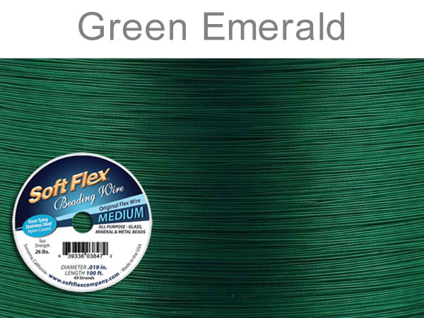 This green colored beading wire is the ultimate in nylon coated jewelry and beading wire. It is fast becoming the standard for professionals and hobbyists. Made up of 49 strands of stainless steel wire encased in nylon for the unbeatable combination of strength and flexibility. 0.019" in diameter (Medium); 100 feet.