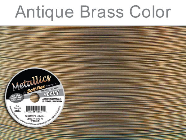 This antique brass colored beading wire is the ultimate in nylon coated jewelry and beading wire. It is fast becoming the standard for professionals and hobbyists. Made up of 49 strands of stainless steel wire encased in nylon for the unbeatable combination of strength and flexibility. Metallic wire enhances any jewelry design and allows the technology of today to reinvigorate the findings of yesterday. 0.024" in diameter (Heavy); 100 feet.