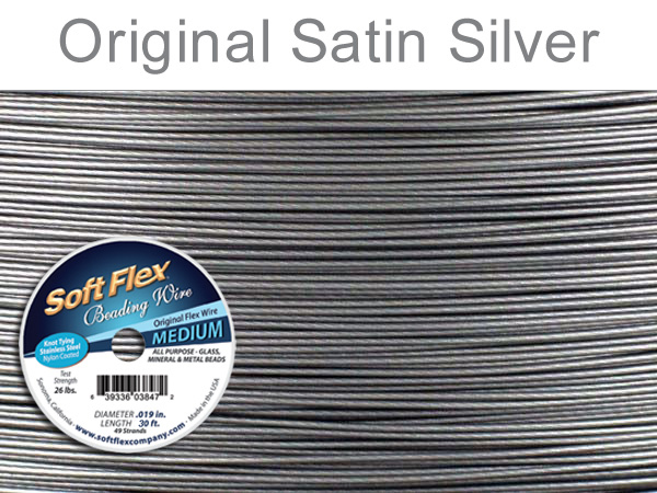 This satin silver beading wire is the ultimate in nylon coated jewelry and beading wire. It is fast becoming the standard for professionals and hobbyists. Made up of 49 strands of stainless steel wire encased in nylon for the unbeatable combination of strength and flexibility. 0.019" in diameter (Medium); 30 feet.