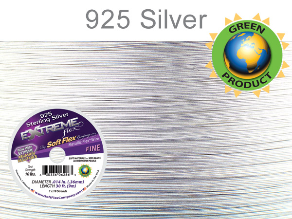 Soft Flex Extreme Wire is a beading wire, free of heavy metals, for designers that want to add sparkle and shine to a piece that exposes the wire. Soft Flex Extreme Wire will not tarnish and is great for free floating necklaces and pendants. Soft Flex Extreme Wire is constructed of 1x19 micro woven metal alloy wires. It is supple enough that it can be knotted. Soft Flex Extreme Wire is recommended for designers that want to be 'green' and desire a high quality wire for high end jewelry. Ideal for soft materials, seed beads and fresh water pearls. Sterling Silver, 0.014 Inch, 30 Feet