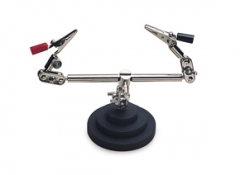 Handy double third hand work holder features clips mounted on a weighted base to hold items stable and secure in any position while soldering. This tool enables user to have both hands free while working.