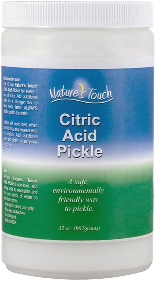 Nature's Touch Citric Acid Pickle is a mild pickling solution used for silver, gold, brass and copper. Also a great cleaner for stainless steel shot. This biodegradable pickle is a safe yet very effective alternative to standard pickling solutions. 2 lb plastic jar. Made in USA.