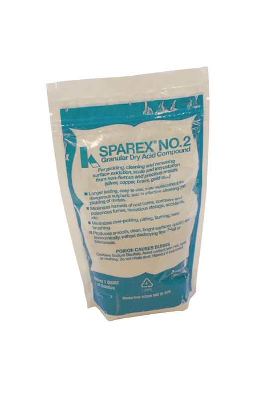 Sparex is an easy to use, longer lasting, safe replacement for dangerous sulfuric acid in effective cleaning and pickling metals. Use Sparex No. 2 for removing surface oxidation, scale and pickling gold, silver and copper based alloys. Non-flammable and non-explosive. 10 oz.
