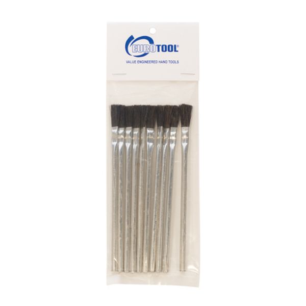 Acid-resistant bristle brushes have crimped all-metal handles. Economical, general purpose utility brush great for one-time use applications to save time and avoid messy cleanups. Suitable for acid, flux, epoxy, glue, paste, touch-ups, solvents and more. Sold in packs of twelve. 3/8" x 6"
