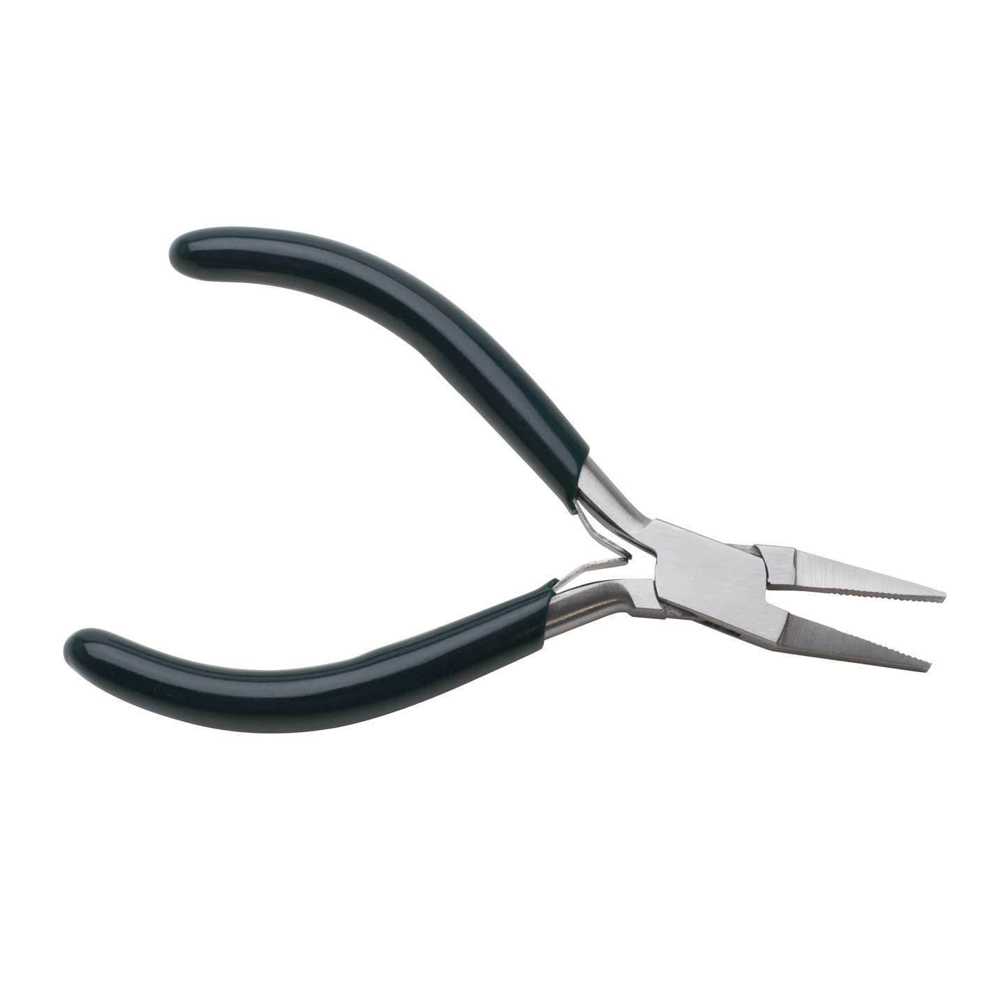 These are a Jewelry Tools best seller. These flat nose pliers, with serrated jaws, were made for students, craftspeople or anyone who needs usable pliers and cutters at reasonable prices and consistent quality. Patterned after our German series for comfort and durability, this series features green PVC grips, double-leaf springs, box-joint construction and brush finish and are 4-1/2" (115mm) long. Inexpensive, but the best buy anywhere in this price range.