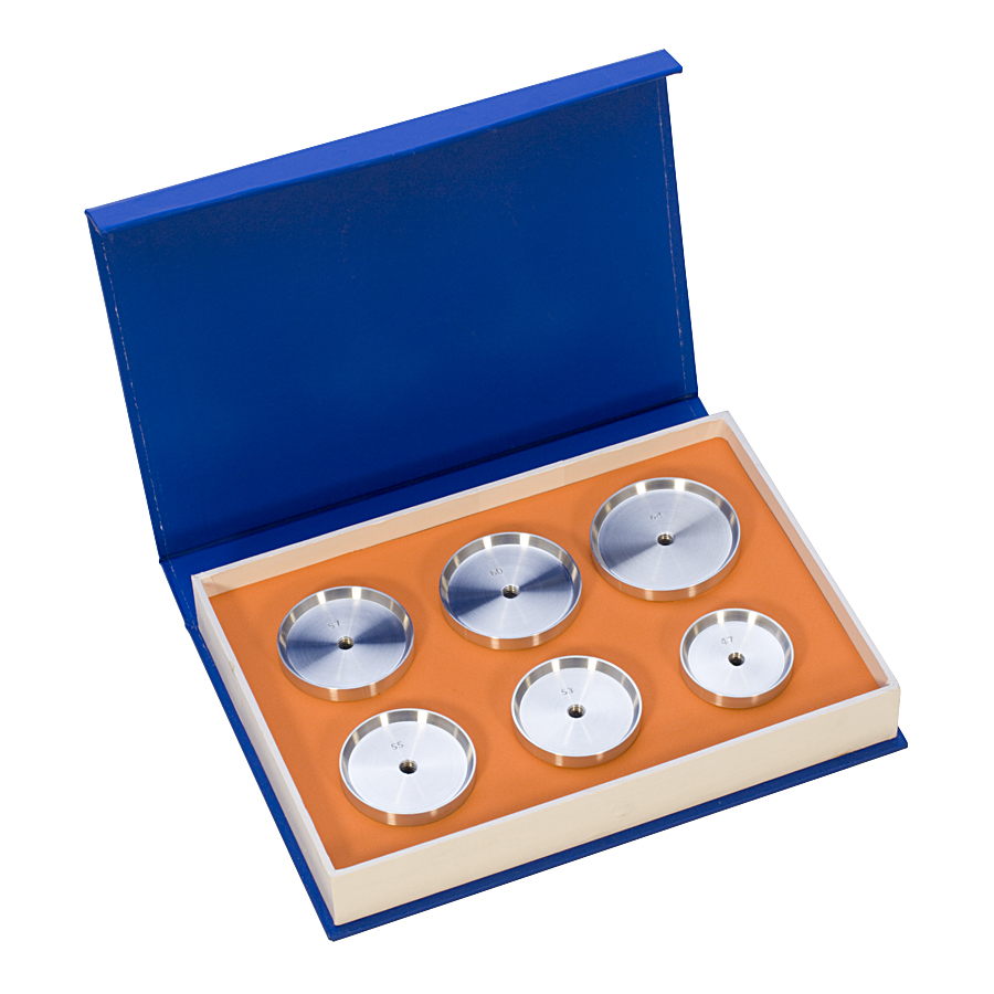 This 6-piece set of large aluminum dies is meant to accommodate larger watches. It can be used with CRY-908.00, our combination case closer/crystal press. This set includes the following die sizes: